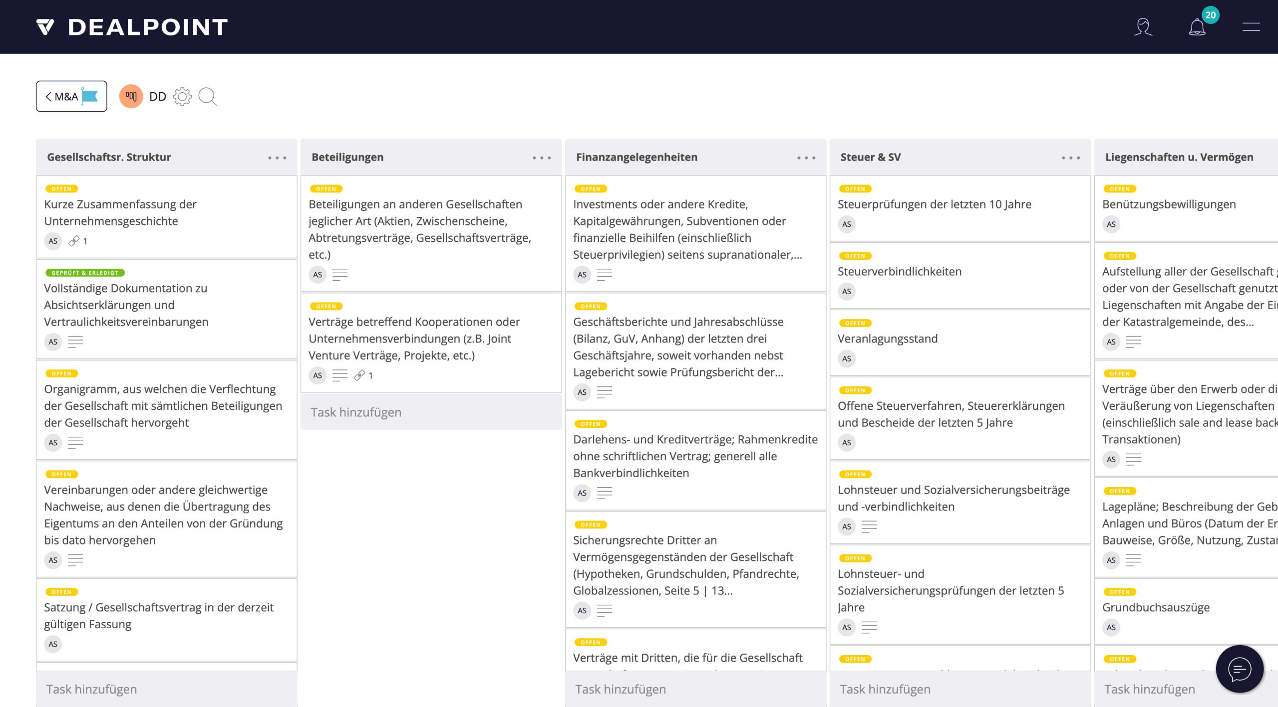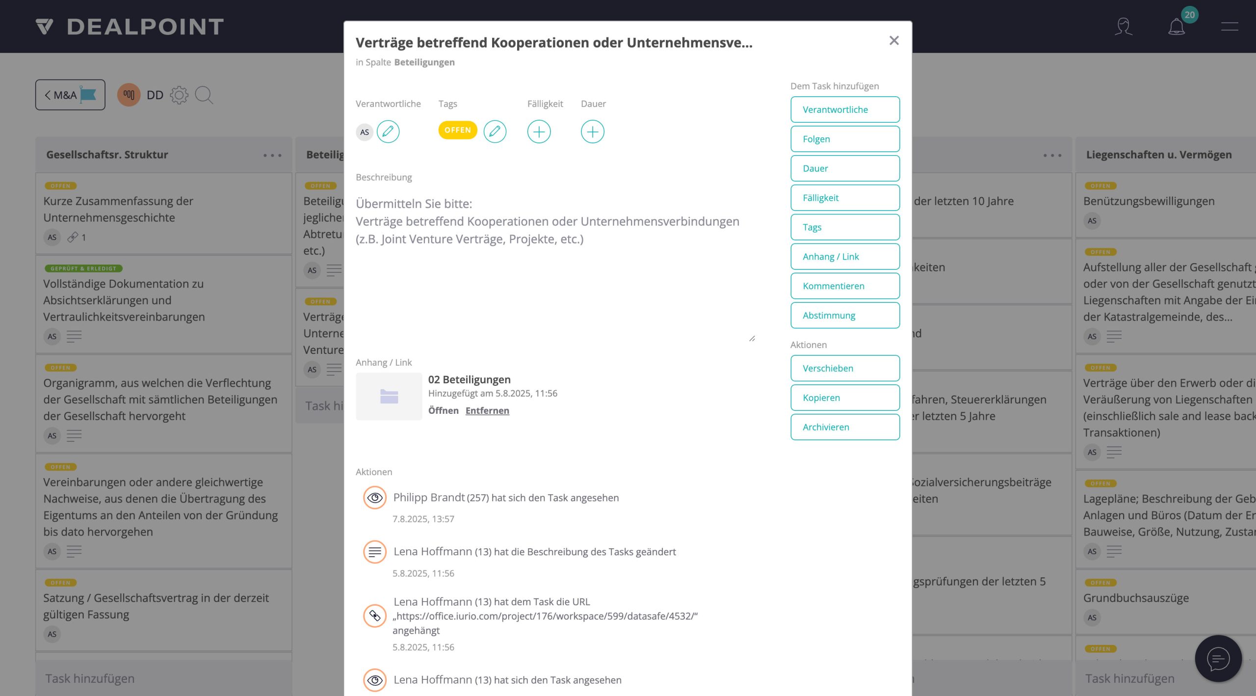 DEALPOINT bietet Ihnen die Möglichkeit, Aufgaben zu beschreiben und kommentieren, Dokumente zu verknüpfen, Fristen hinzuzufügen und vieles mehr.
