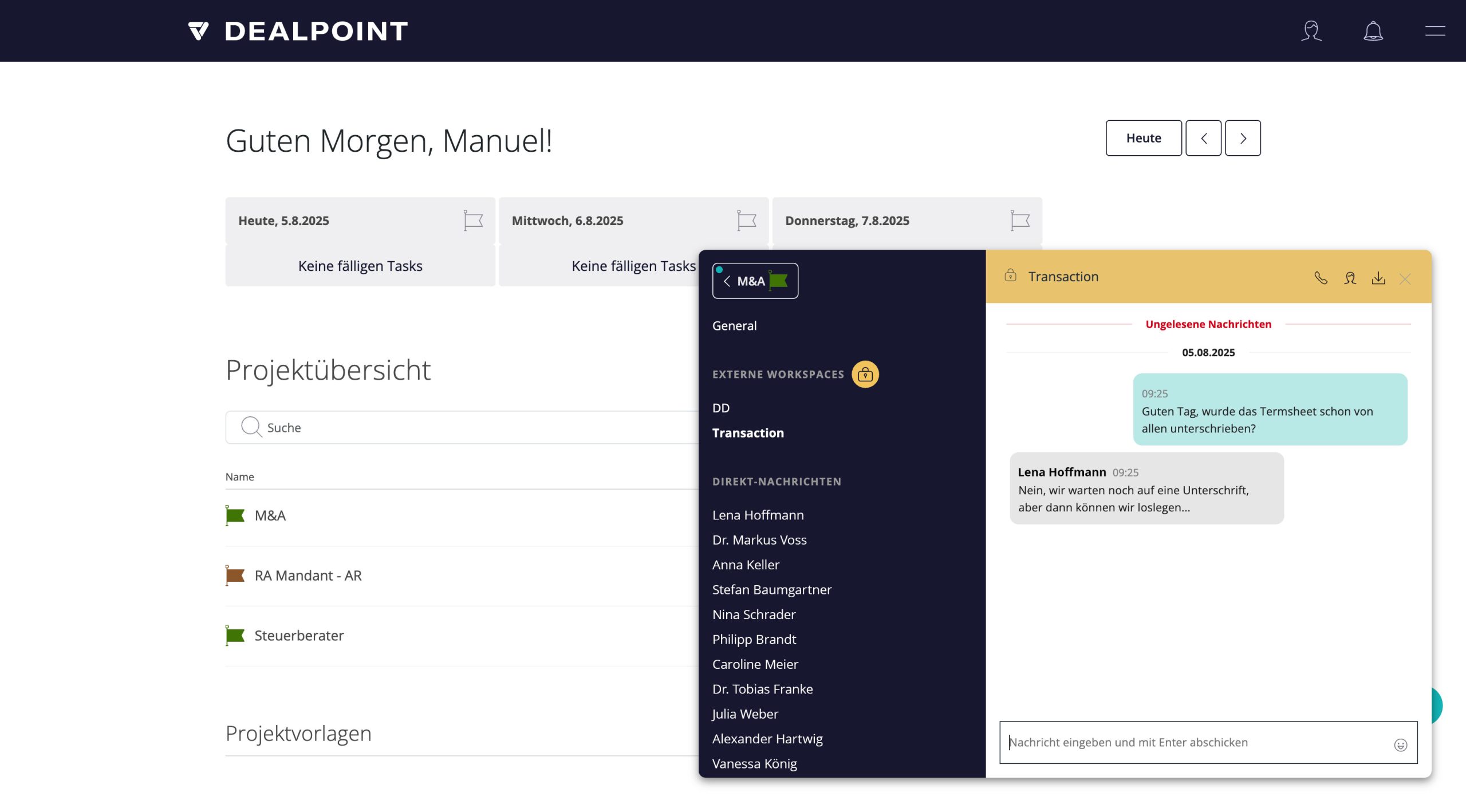 Mit DEALPOINT können Sie festlegen, welche Funktion ein Projekt wirklich braucht. Und welche Teilnehmer in einem Workspace zusammenarbeiten werden.